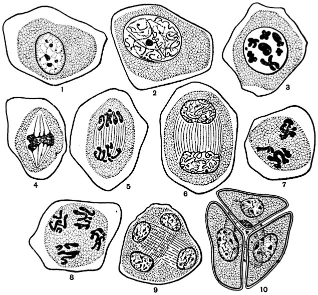 1-6 - гетеротипное деление; 7-10 - гомеотипное деление; 1 - интерфаза; 2 - ранняя профаза (лептонема); 3 - диакинез; 4 - ранняя анафаза; 5 - поздняя анафаза; 6 - телофаза, переходящая в профазу гомеотипного деления; 7 - метафаза; 8 - анафаза; 9 - поздняя телофаза; 10 - сформированная тетрада микроспор. В мейозе число хромосом уменьшается вдвое. Мейоз состоит из двух быстро следующих друг за другом делений ядра. Из этих делений первое называется гетеротипным (от греческого "гетерос" - различный), второе - гомеотипным (от греческого "гомойос" - одинаковый). Эти названия даны потому, что в первом делении происходит существенная перестройка хромосомного аппарата ядра, в результате чего два дочерних ядра оказываются различными и гаплоидными, а во втором делении, сходном с обычным митозом, образуются одинаковые дочерние ядра, в данном случае тоже гаплоидные (рис. 25, 26). В мейозе, как и в митозе, различают профазу, метафазу, анафазу и телофазу. 55