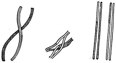 Слева - две гомологичные хромосомы, состоящие каждая из двух хроматид, образовали хиазму (перекрест); посредине - две хроматиды. обменялись участками; справа - четыре хроматиды, из которых две обменялись участками. Профаза гетеротипного деления - наиболее длительная и сложная фаза, так как здесь происходит подготовка к редукции числа хромосом. Профазу гетеротипного деления подразделяют на несколько стадий. В ранней профазе - лептонеме - хромосомы заметны в виде отдельных очень тонких хроматиновых нитей (рис. 25, 2). Известно, что на этой стадии число нитей равно диплоидному числу хромосом. Немного позднее, в зигонеме, хроматиновые нити сближаются попарно, соединяясь во многих точках. При этом, по-видимому, происходит не случайное, а выборочное сближение: сближаются только гомологичные хромосомы, т. е. одинаковые по форме и происходящие от разных гаплоидных ядер. Еще позднее, в пахинеме, нити (гомологичные хромосомы) соединяются (конъюгируют) по всей длине и заметно укорачиваются. Двойственная природа образовавшихся хромосом плохо заметна. Общее число двойных хромосом гаплоидно. Далее, в диплонеме, каждая гомологичная хромосома расщепляется на две хроматиды, которые остаются соединенными лишь в отдельных точках. Таким образом, каждая двойная хромосома содержит четыре хроматиды. В конце профазы - диакинезе - двойные хромосомы очень сильно укорачиваются, утолщаются и располагаются по периферии ядра (рис. 25, 3). В диакинезе очень легко подсчитать число хромосом (бивалентов) и точно установить, что оно гаплоидно. Довольно часто, 56 по-видимому как результат фиксации, в ранних стадиях профазы хромосомы собираются в более или менее плотный комок, сдвигающийся к одной стороне ядра. Это явление называется синапсисом или синизезисом. В метафазе появляется ахроматиновое веретено, исчезают ядерная оболочка и ядрышки, которые, как и в митозе, не принимали непосредственного участия в указанных перегруппировках. В поздней метафазе хромосомы в гаплоидном числе слагаются в ядерную пластинку. Они здесь заметно отличаются по форме от типичных хромосом митоза (в общем более короткие и толстые) и представляют биваленты, т. е. пары сближенных гомологичных хромосом. В метафазе каждая хромосома сначала бивалентна, затем она расщепляется вдоль, так что в результате получается образование из четырех элементов, разделенных продольными щелями в двух взаимно перпендикулярных направлениях: одна щель, называемая редукционной, отделяет гомологичные хромосомы друг от друга, а другая, называемая эквационной, отделяет их хроматиды, т. е. половинки. В анафазе происходит расхождение гомологичных хромосом, т. е. разъединение их по редукционной щели (истинная редукция), но в это время каждая из расходящихся хромосом уже состоит из двух сформированных хроматид (рис. 25, 4, 5). За гетеротипным сейчас же следует гомеотипное деление. Поэтому телофаза первого сильно сокращается, как сокращается и профаза второго. Телофаза непосредственно переходит в профазу гомеотипного деления (рис. 25, 6). В анафазе хромосомы расходятся по эквационной щели (рис. 25, 8). При гетеротипном делении гомологичные хромосомы распределяются случайно и хромосомы каждого бивалента могут с равной вероятностью отойти к одному или другому полюсу делящегося ядра. Следует отметить, что в профазах мейо