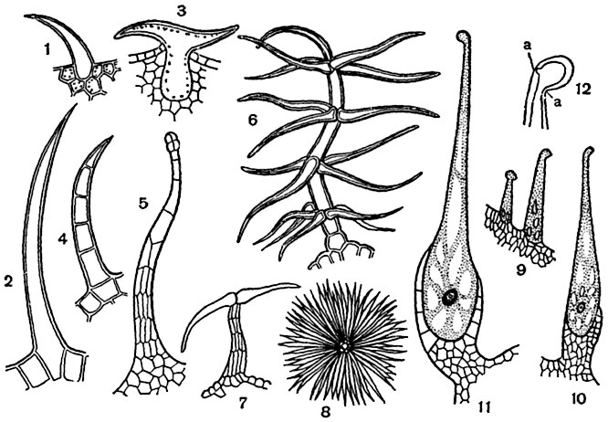 1, 2 - подмаренник (Сalium); 3 - хмель (Humulus); 4 - наперстянка (Digitalis); 5 - камнеломка (Saxifraga); 6 - коровяк (Verbascum); 7, 8 - лох (Elaeagnus); 9-12 - жгучий волосок крапивы (Urtica); а - обламывающаяся верхушка волоска. 116 1 Наличие хлоропластов характерно для эпидермиса споровых растений. Сравнительно крупные и ярко окрашенные хлорофилловые зерна содержат клетки кожицы листьев папоротников. 2 Однако одна из групп печеночников - маршанциевые - лишена настоящих устьиц: слоевище их имеет "дыхательные отверстия", аналогичные по функции устьицам, но совершенно отличные по устройству (см. в разделе "Систематика растений"). |