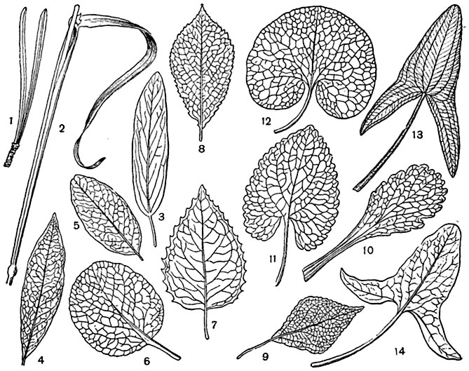 1 - игольчатый; 2 - линейный; 3 - продолговатый; 4 - ланцетный; 5 - овальный; 6 - округлый; 7 - яйцевидный; 8 - обратно-яйцевидный; 9 - ромбический; 10 - лопатчатый; 11 - сердцевидно-яйцевидный; 12 - почковидный; 13 - стреловидный; 14 - копьевидный лист.